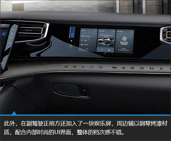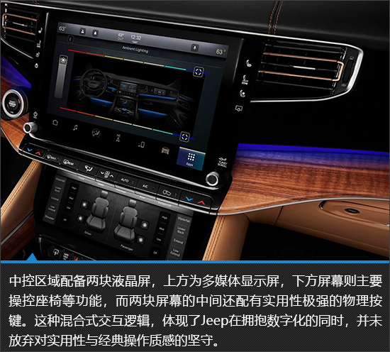 新款Jeep Grand Wagoneer的内饰在传承标志性美式开阔空间感的同时,进行了一场显著的科技升级。其座舱核心由多块高规格屏幕构成,共同构建出沉浸式数字体验。尤为值得一提的是,其中控区域采用双屏与实用物理按键相结合的混合式交互逻辑,在拥抱科技感的同时,保证了操作的直观与高效。
