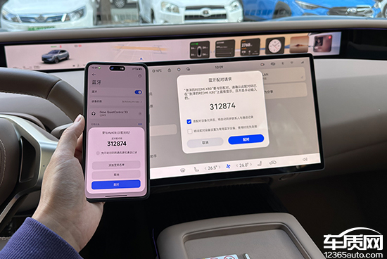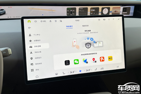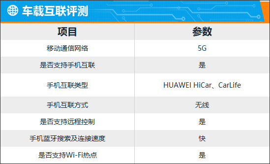 车载互联部分,评测车配备5G网络,支持车联网、OTA升级、Wi-Fi热点以及手机APP远程控制功能。实测蓝牙的搜索及连接速度均相当不错,体验感较好。此外,系统还配有无线投屏功能,目前支持鸿蒙系统,未来OTA升级后还支持安卓以及苹果系统,打破生态壁垒。