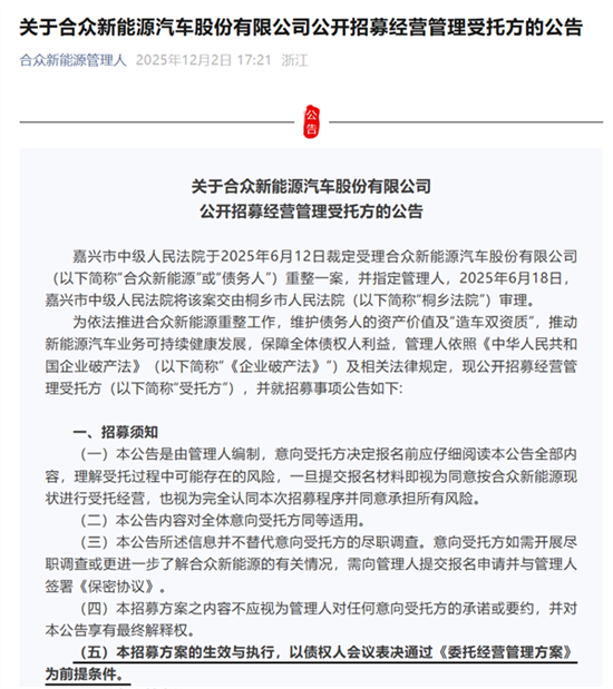 公告称,为依法推进合众新能源重整工作,以及维护债务人的资产价值及“造车双资质”,现公开招募经营管理受托方。