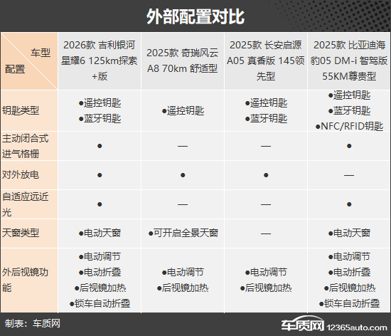 在外部配置对比方面,吉利银河星耀6的配置最为丰富;比亚迪海豹05 DM-i虽然未配备对外放电功能,略显逊色,但却是唯一支持NFC/RFID钥匙的车型;奇瑞风云A8的优势在于提供了可开启全景天窗;长安启源A05的配置水平则相对平淡,缺乏亮点。