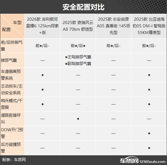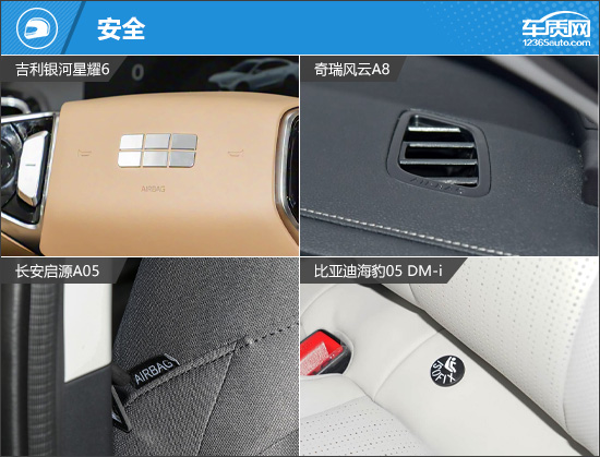 安全配置方面,比亚迪海豹05 DM-i的表现最为全面,其主动安全配置堪称丰富,主动刹车/主动安全系统、哨兵模式/千里眼等均有配备。奇瑞风云A8的优势则体现在被动安全层面,是四款车中唯一配备后排侧气囊和主副驾膝部气囊的车型,同时,在主动安全部分还独享道路救援呼叫功能。相比之下,长安启源A05表现拉胯,主被动安全配置缺失较多。