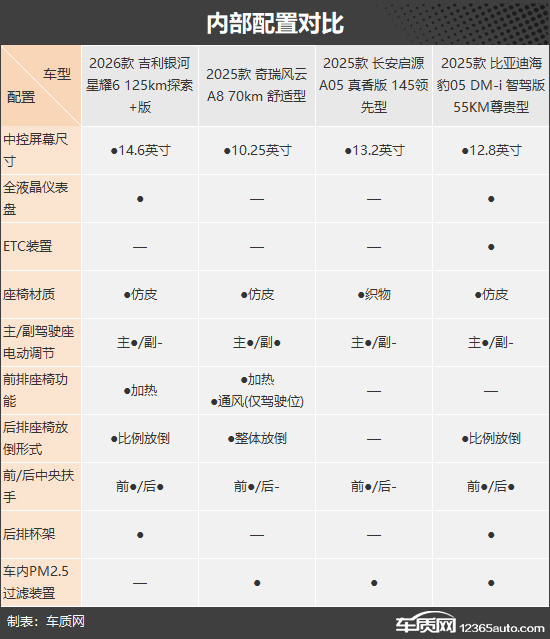 本次推荐的四款车型分别为吉利银河星耀6、奇瑞风云A8、长安启源A05和比亚迪海豹05 DM-i。它们的售价十分接近,其中既有新晋车型,也有已在市场中树立口碑的代表作,体现了当前该级别车型的主流产品力水平(由于目前图片数量有限,部分车型图片为示意图,仅供参考)。