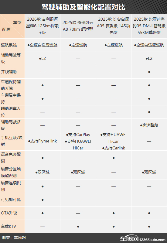 智能化方面,吉利银河星耀6的表现最为全面,各项主流功能均有配备,但作为四款车型中唯一不支持车载KTV的车型,仍显得略有遗憾;相比之下,奇瑞风云A8智能化水平逊色不少,连当下普遍拥有的OTA升级也未能配备,整体表现明显处于下风。