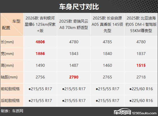 车身尺寸方面,吉利银河星耀6在车长和车宽上占据领先,为其大气的视觉效果奠定了基础;奇瑞风云A8的轴距独占鳌头,可带来更为宽敞的后排乘坐空间;比亚迪海豹05 DM-i凭借较高的车身,为乘员的头部空间留出更多余量。长安启源A05虽然尺寸数据并无突出优势,但整体表现均衡,同样能提供舒适的座舱空间。