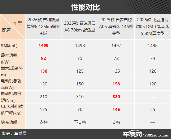 性能方面,四款车均搭载由1.5L自然吸气发动机与单电机组成的插电混动系统。其中,吉利银河星耀6的发动机参数最为突出,而长安启源A05则在电动机参数上占优,同时还拥有最长的CLTC纯电续航里程,不仅可减少补能频率,还能进一步降低用车成本。此外,这两款车均支持快充功能,在充电效率方面同样取得领先。