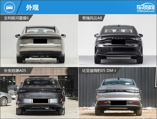 四款车型在外观设计上均展现出年轻化气质,但在细节表达上各具特色。吉利银河星耀6延续经典的涟漪美学,大尺寸进气格栅气势十足,颇具豪华范儿;奇瑞风云A8相对更为稳重,车头大面积点阵式格栅提升了视觉张力;长安启源A05采用未来光域前脸与数字流光贯穿尾灯的组合,搭配笔直线条营造出强烈的凌厉感;比亚迪海豹05 DM-i则以更为圆润的造型诠释海洋美学,将运动气质与柔和之美有机融合,极具辨识度。