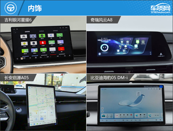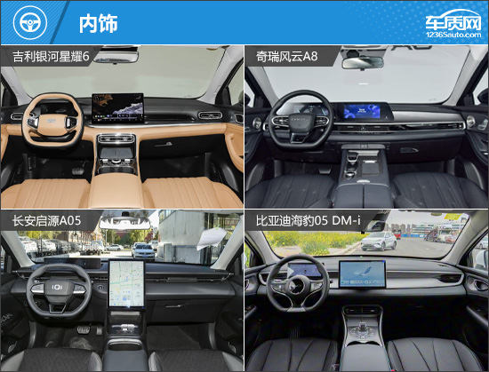 内饰部分,四款车均采用当下流行的极简设计风格,但在屏幕布局上各有不同。其中,奇瑞风云A8为双联屏造型,整体风格相对传统;长安启源A05则配备竖向中控屏,视觉效果更具冲击力。虽然四款车的售价不高,但座舱内依旧应用了较大面积的软质包覆,质感表现不俗。换挡形式方面,吉利银河星耀6与长安启源A05采用电子式怀挡换挡,更符合新能源车的发展趋势。