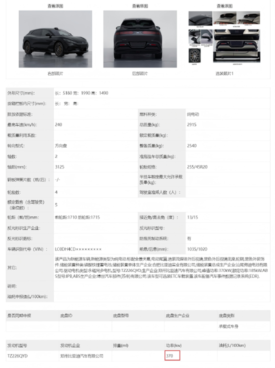 根据公告信息来看,三电机峰值功率为230kW/310kW/310kW,较现款有着较大幅度的提升,最高时速则可达270km/h。值得一提的是,备案的纯电版车型中,有一款370kW车型,疑似将为单电机版本,能为用户提供更多的选择。