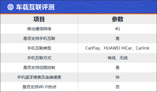 车载互联部分,评测车配备4G网络,支持OTA升级、手机APP远程控制功能。实测蓝牙的搜索及连接速度均相当不错,体验感较好。此外,评测车还配备CarPlay、HUAWEI HiCar以及Carlink手机互联,能够满足不同用户的使用需求。