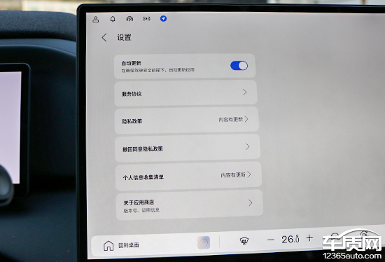 车机系统内置应用市场,实测APP数量非常少,应用推荐内仅有一个哔哩哔哩,尚不清楚是否为评测车的个体情况。设置界面略显简陋,真正实用的只有一个自动更新的开关选项。
