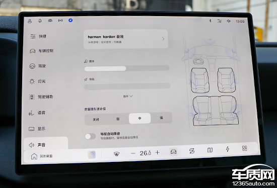 评测车搭载Harman Kardon尊贵级音响系统,配备23个精密扬声器,驾驶员头枕扬声器为通话等需求营造私密音域。软件方面,系统内提供了丰富的调节内容,包括音量随车速补偿、声场调节、3D环绕音效增强以及均衡器。当设置完成后,用户可以在该界面内直接试听音乐,方便继续进行微调,我个人认为这个功能非常实用。