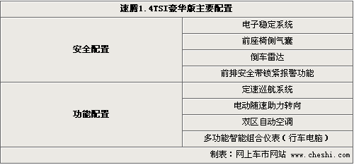 在功能和安全配置上,速腾1.4TSI豪华版配备了前座椅侧气囊,同时增加了只有2.0排量车型上有的定速巡航,双区自动空调。而倒车雷达、电子稳定系统均属于标准配备,除此之外多功能智能组合仪表以及行车电脑也将配备在这款车上。笔者从北京地区一汽大众经销商处了解到,在充分贯彻实施大众动力总成的战略的趋势下,速腾1.4TSI车型的上市将逐渐取代2.0排量,1.4TSI车型的上市将大大提升速腾系列在同级别车型中的市场竞争力。
