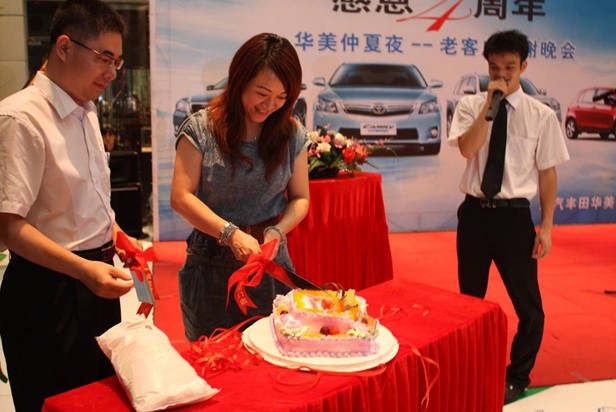 6月19日晚,广汽丰田华美虎门店为庆祝广汽TOYOTA渠道成立四周年和凯美瑞上市四周年,举行了“华美仲夏夜----老客户答谢晚会”,数百位华美丰田新老车友和各界嘉宾欢聚一堂,共同分享这美好的夜晚。