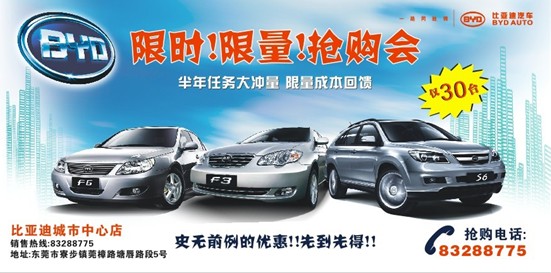 6月26日(星期日),比亚迪东莞寮步峰德行城市旗舰店为回馈新老客户的支持与厚爱,特在峰德行展厅举行由比亚迪汽车销售公司主办的“我爱比亚迪 团购更给力”特价抢购会活动。届时,比亚迪全系列车型F6\F3\M6\将给出前所未有的优惠价。