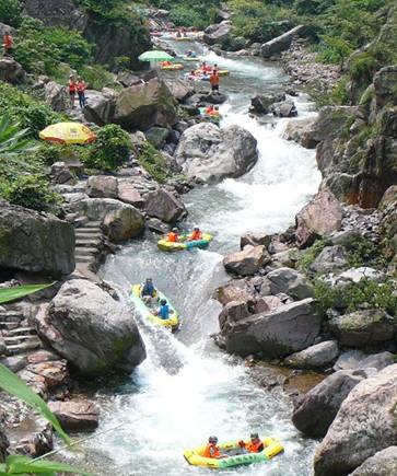 【老虎谷暗河漂流】全长3.8公里,蜿蜒曲折,落差达96米,河道穿越800多米的山体。据说,穿山透石的暗河漂流在全国不多见。在如画的山水间感受一次惊心的漂流。