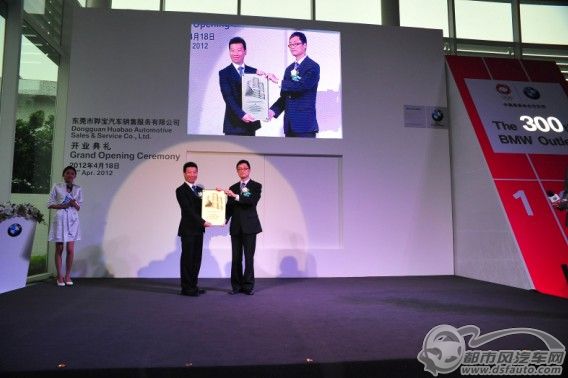 华晨宝马汽车有限公司经销商发展总监朱彤先生向东莞骅宝总经理林迦勒先生递授权牌