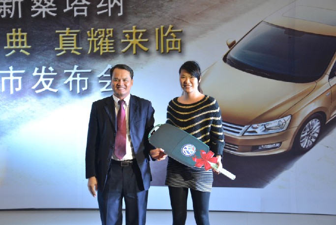 南方亚飞4S店总经理徐庆年将车钥匙交给首位车主