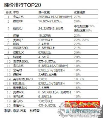 南都记者走访市场了解到,五一虽然已经结束,但车商的促销大战并没有停下来。目前市场上仍然有诸多车型的优惠超过15%,其中降价最为豪气的是打算改款换代的车型,南都记者特地走访市场,为大家带来降价排行榜TOP20。对有心买车的消费者来说,目前仍然是淘笋货的好时机。但考虑到在前段时间的促销大战中,有些畅销车型的库存不多,并且颜色不全,所以想在本月购车的客户得尽快下手,才能保证尽早提车。