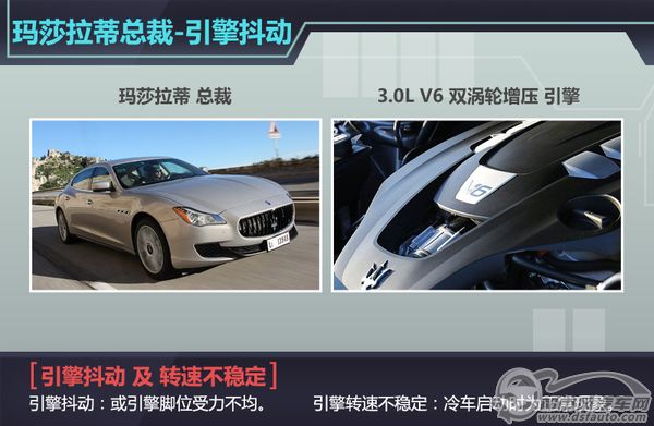 车主在使用中发现玛莎拉蒂总裁在转向时存在异响;冷车时发动机抖动,转速不稳定;车侧易受到飞溅起的石子撞击;驾驶座车窗漏风;后备箱损坏;安全带摩擦座椅,座椅掉漆;座位后面的储物袋脱胶以及整车充斥着强烈的塑料感和粗糙感等一系列问题。而针对以上问题,汽车行业技术专家已给出了多项应对方案。