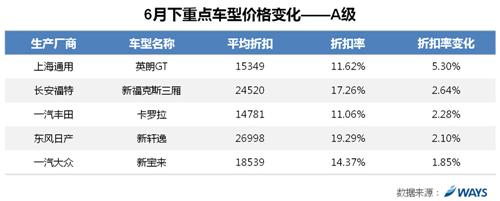 2015年6月份,消费者购车意愿依旧偏低,在5月份整体汽车市场价格下调、收益甚微的情况下,6月份各大厂商继续加大优惠力度,冲击上半年销量目标。根据汽车行业研究公司威尔森发布的最新车市价格分析报告,市场需求持续低迷,厂家为把握上半年冲量的最后机会,纷纷增加销售支持,6月整体市场价格持续走低, A级、B级和SUV市场价格下降。