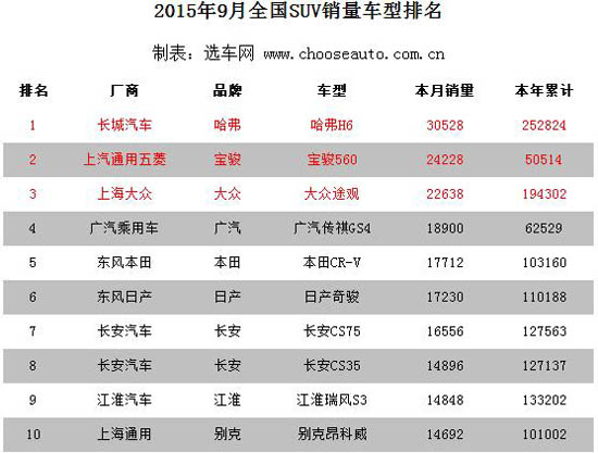 从企业销量排行来看,前十名分别是长城汽车(601633,股吧)、北京现代、长安汽车(000625,股吧)、东风本田、东风日产、上汽通用、上海大众、上汽通用五菱、江淮股份和广汽乘用车。与上月相比,上海大众销量增速略低,其他企业呈较快增长。9月,上述十家企业共销售30万辆,占SUV销售总量的52.95%。其中,自主品牌占据5席。