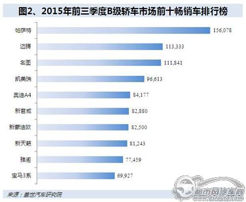 与SUV销量持续增长相比,轿车市场销量节节败退,但轿车在整个车市中仍旧有着无可争议的地位。根据盖世汽车研究院整理数据,2015年前三季度轿车在整个乘用车市场贡献了59.4%的销量,销售820.5万辆新车。其中堪称国内车市风的向标和品牌决战地的B级车,前三季度销量实现157.7万辆,同比下跌1.2%,占据轿车市场19.2%的销量,相对其他轿车市场表现相对较好。