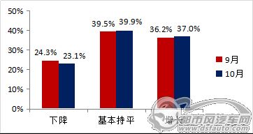 10月份,集客量相比上月有所下降,认为集客量下降的经销商比例由上月的27.6%升至27.7%;认为增长的比例由30.3%降至28.9%;认为基本持平的比例由42.1%升至43.4%。