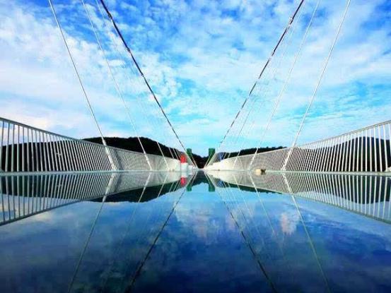 (玻璃桥)观牛鱼嘴青翠的山谷峭壁,玻璃吊桥宛如一条巨龙悬空横在两山之中,吊桥由铁索和多块巨大透明玻璃搭建而成,桥全长达250米,离地高度超200米,游客行走其上,可俯瞰山谷的森林景色和各种山花,隐藏在密林里的禾雀花更是风情万种、分外妖娆。昨天恰好又遇大风天,但玻璃桥稳如磐石,游客听着松涛阵阵,感受山风拂面,那种置身空中的刺激感。