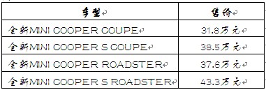 3月18日,MINI家族全新MINI COUPE硬顶跑车和全新MINI ROADSTER敞篷跑车搭载COOPER和COOPER S发动机正式登陆东莞市场。率先上市的4款跑车的官方指导价分别为: