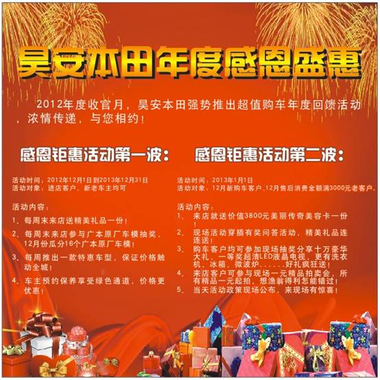 一年之计于年初,一年之惠于年底。长安昊安本田自开业12年以来,累积销售量已超12000台,得到广大新老客户的支持和关爱。12月,在广汽本田的强力支持下,公司领导决定举办一年一度的年度感恩盛惠活动。