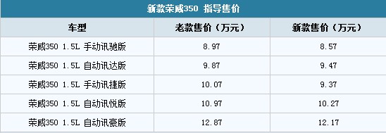 近日,我们获悉,新款荣威350已在各地4S店开售,相比老款,新款350在配置方面有所调整,新车共有5款车型以供选择,售价区间为8.57-12.17万元,相比老款价格有所降低。而之前我们报道过的1.5T版荣威350并没有一起上市。价格详情见下表: