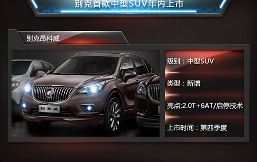 别克首款中型SUV-昂科威车型采用了家族的设计,以愿景Envision为设计蓝本,命名上也采用了家族化的方式,其命名为昂科威。同时上海通用官方公布了部分车型参数以及配置,其搭载了最强劲的2.0T引擎,并匹配6AT变速器;在配置上,其也搭载了诸如启停技术、四驱系统等。