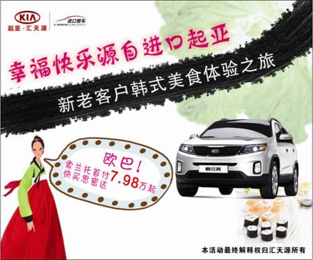 销售车型:进口起亚全系(K7凯尊、第三代佳乐、第三代索兰托、霸锐、速迈、威客,VQ-R2.2T)