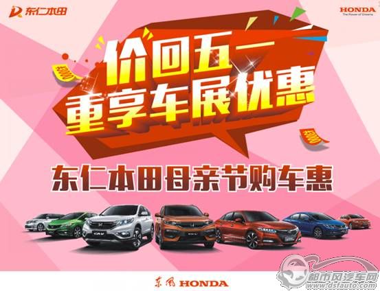 活动主题:“价”回五一重享车展优惠 东仁本田母亲节购车惠(庆东仁本田五一车展销量突破100台,母亲节特惠购车节)。