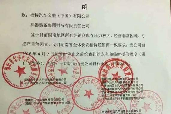 鉴于目前湖南地区所有经销商库存压力极大、经营非常困难、亏损严重等因素,我们湖南省全体长安福特经销商一致要求:贵公司自2016年4月7日起暂时停止之前给我们的永久和临时授信额度(进口车除外),否则,一切后果由贵公司自行承担。特此函告。