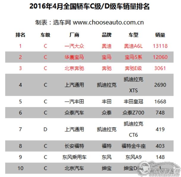 4月C级车销量整体平稳,奥迪A6L、宝马5系雄踞前两位难以撼动,奔驰E级继续守擂第三,福特金牛座降至第八,销量大幅缩水,凯迪拉克XTS发力,皇冠销量持续萎靡,而上月差点被“判死刑”的凯迪拉克CT6,本月回温。