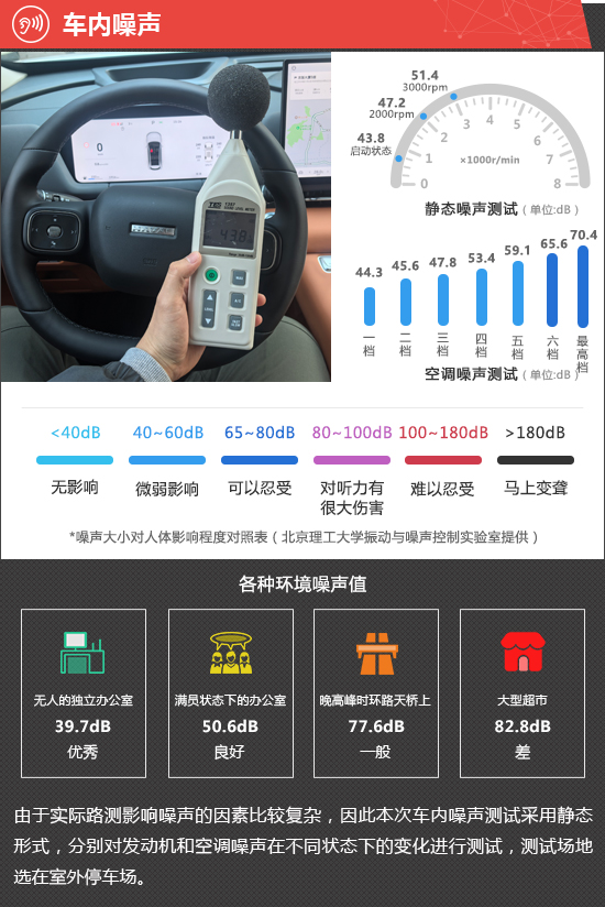 在静态噪声测试环节,评测车在启动状态下车内实测噪声值为43.8dB,在测试过的同级别车型中处于下游水平。从测试数据来看,发动机在2000rpm和3000rpm时,传入车内的噪声值分别为47.2dB和51.4dB,整体表现处于同级别车型中游水平。