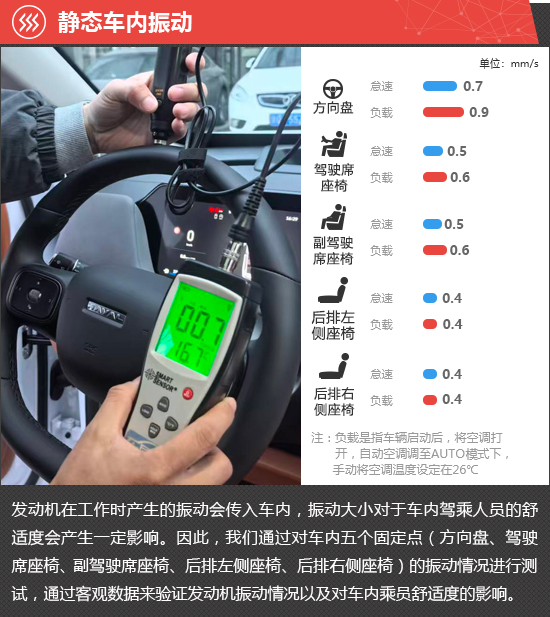 在静态车内振动测试环节,怠速状态下方向盘处的振动数值为0.7mm/s,负载状态下提升至0.9mm/s,振动感受明显。而车内座椅的振动数值相对同级别车型均值偏高,前排座椅怠速和负载状态的振动数值相差0.1mm/s,后排座椅则没有变化。