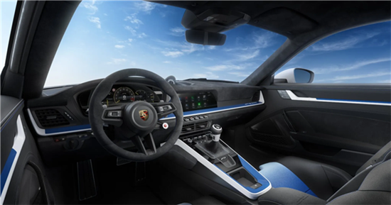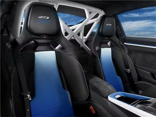 内饰同样延续了相同的设计思路,真皮内饰采用竞速蓝与白色双缝线工艺,同色系细节延伸至配套皮夹与钥匙包,仪表盘、中控台面及车门饰板均配有蓝白相间装饰嵌件,运动座椅则专属定制靛蓝印染纹路。